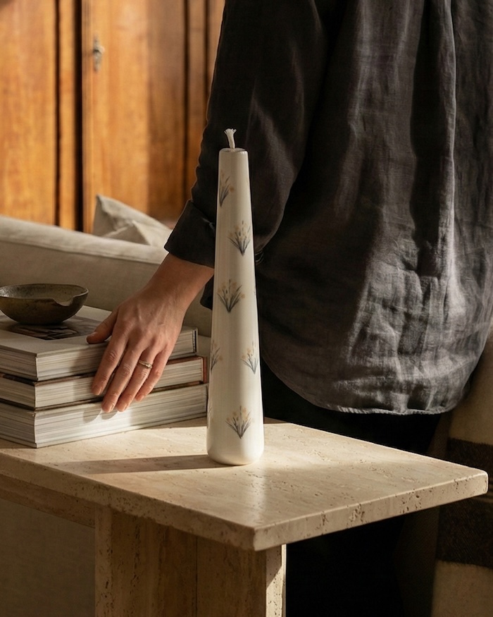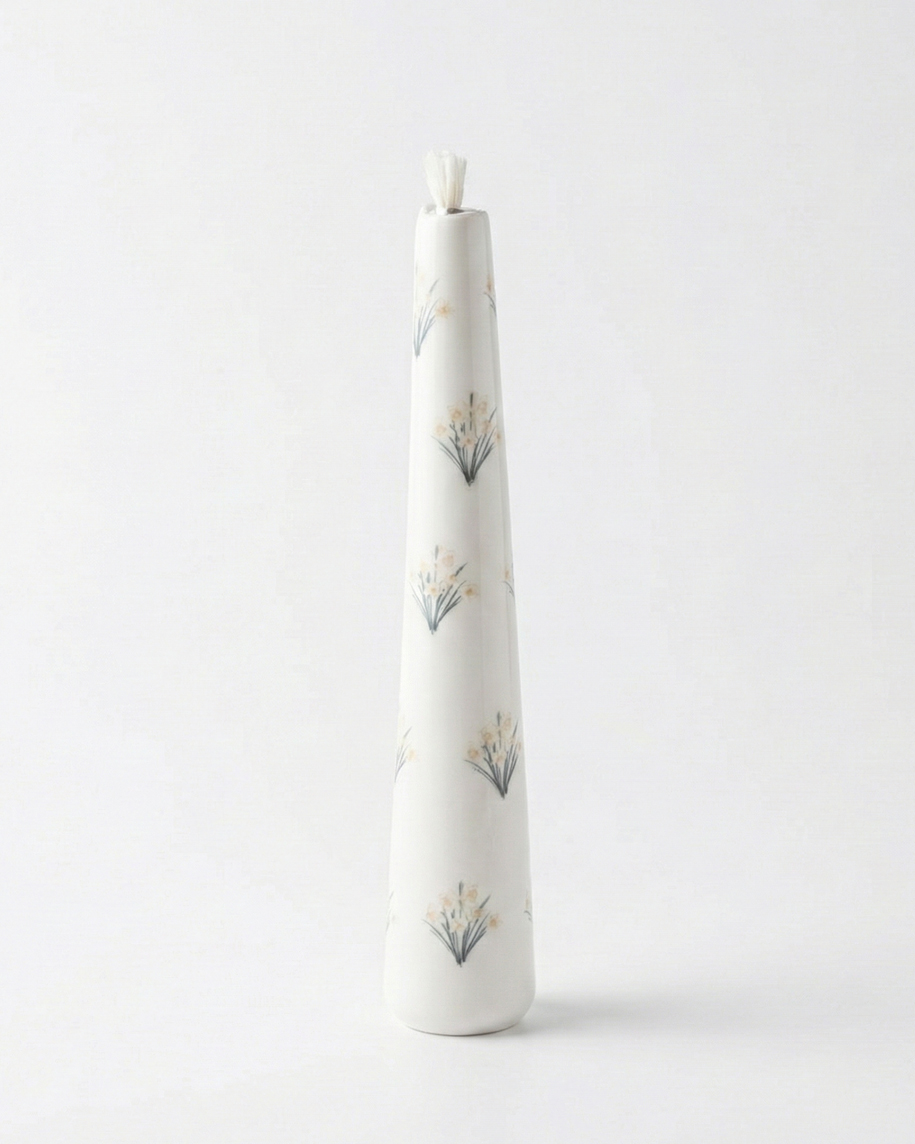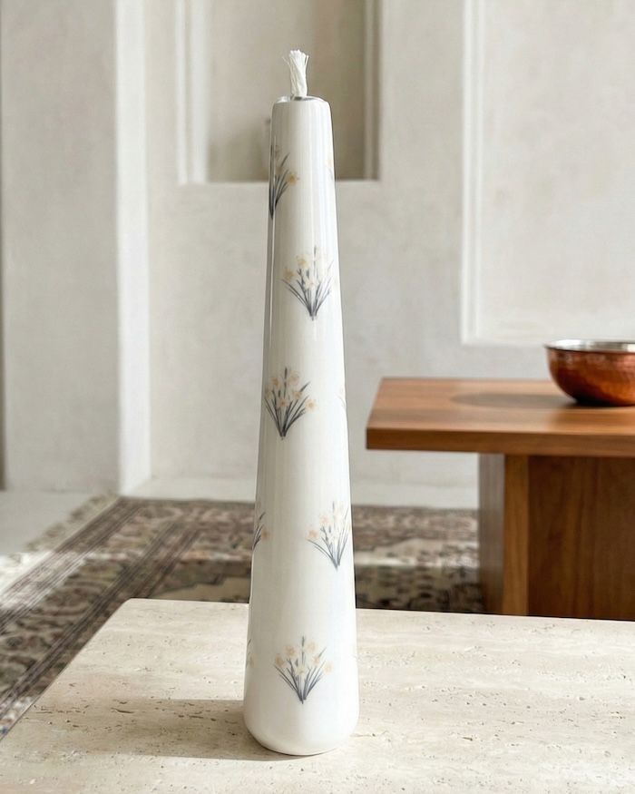 بدنهی این شمع از سرامیک ساخته شده و با ظرافت و دقت بالا شکل گرفته است و همزمان یک شمع مصرفی و یک المان تزئینی است.